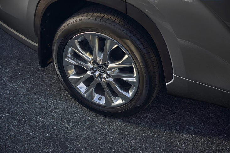 Limited grades step up to 20-inch alloy wheels with a more sophisticated finish. Power-folding heated mirrors include turn signals, blind spot warning indicators, and puddle lights that project the Highlander logo. The grille features black paint with chrome-plated surround for an upscale appearance.
