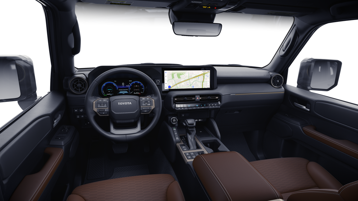 The Toyota LED logo illuminates white when the front doors are open to help with entry into the Land Cruiser.