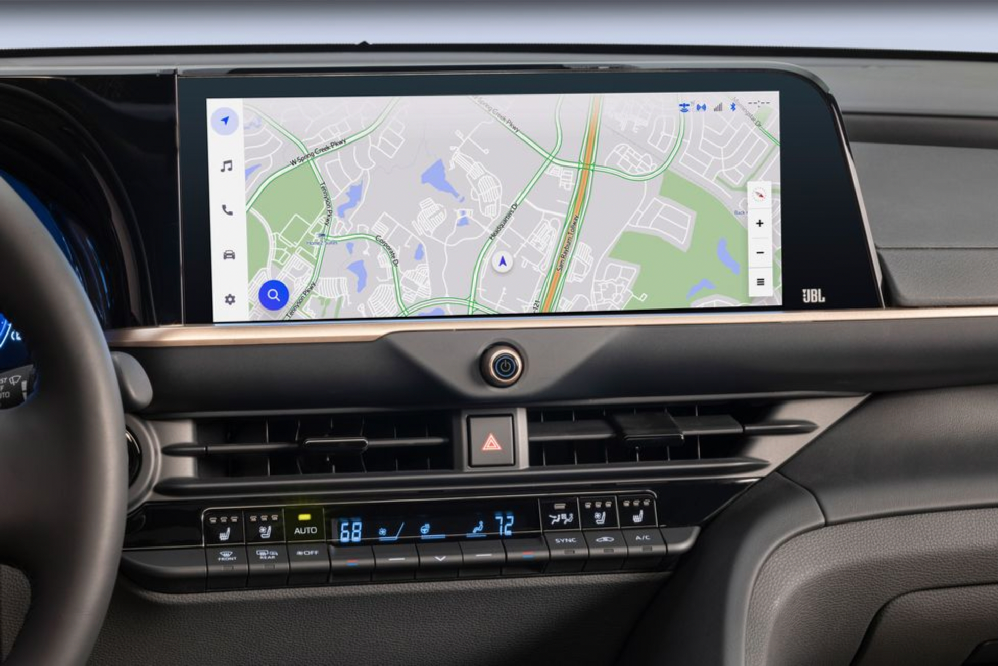 Creating a handsome look, a rich woven fabric is combined with Softex upholstery. On the dash, there is a large touch screen with the Toyota Multimedia System. Design elements include a thin illuminated control panel beneath the screen. Along the lower row, Toyota puts all the important switches.